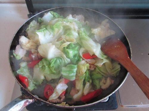 10. 加入肉片:将炒好的肉片重新放入锅中,与包菜一起翻炒均匀。